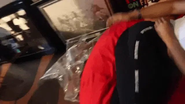 6ix9ine in a shiny red jumpsuit sitting on stacks of money, smiling and posing.