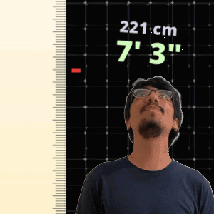 a man with glasses is standing in front of a ruler that says 221 cm 7 ' 3 "