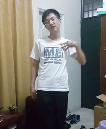 A man wearing a white t-shirt with 'ME Mechanical Engineering' print, standing indoors and gesturing.