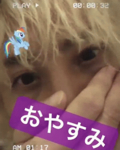 Genki Takebuchi from 8psb with a 'Good night' sticker, featuring a Rainbow Dash pony.