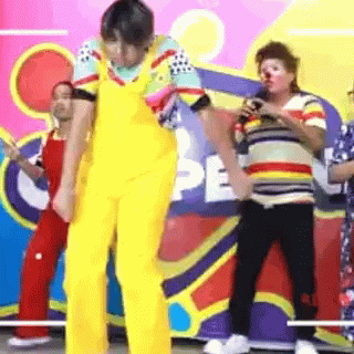 Man in bright yellow overalls performs an energetic dance on stage, accompanied by others.