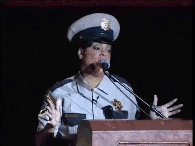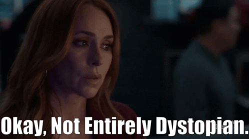 a woman says " okay not entirely dystopian " in front of her face