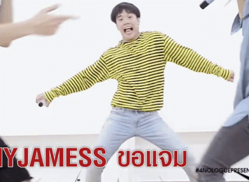 Jamyjames strikes a funny, energetic pose in a yellow and black striped shirt, part of the 9x9 event.