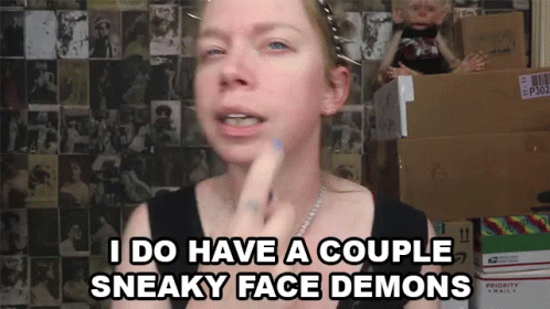 Bunny Meyer points out her 'sneaky face demons' (pimples) on her face in this vlog clip.