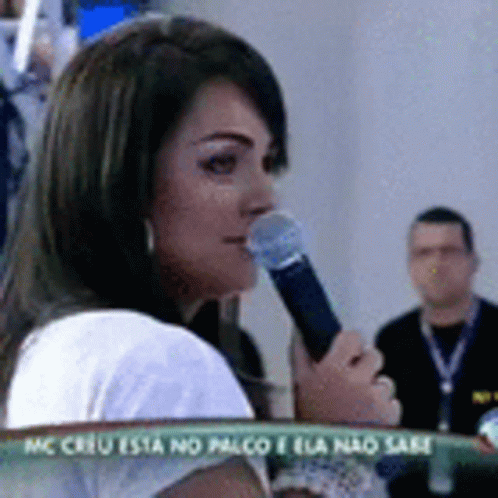 A singer on A Fazenda Record is surprised by MC Creu's appearance on stage, holding a microphone and smiling.