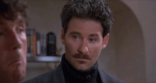 Kevin Kline as Otto in A Fish Called Wanda, looking intently at another man in a dramatic scene.