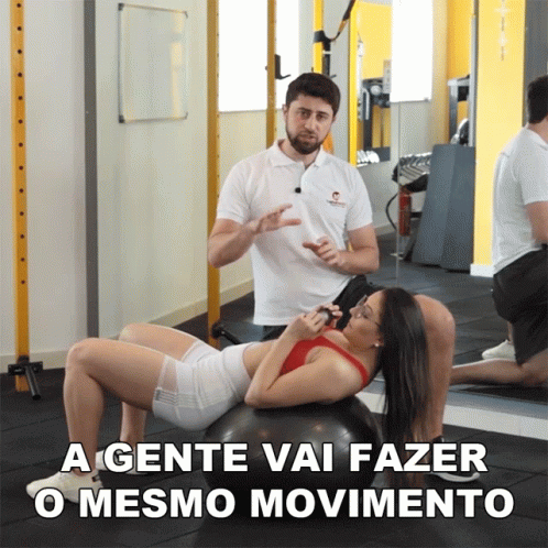 Sandro Lenzi instructs a woman on a stability ball, demonstrating the same movement for exercise in a gym.