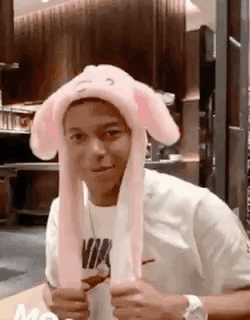 A man wearing a pink bunny hat with floppy ears smiles and laughs, looking directly at the camera in a restaurant setting.