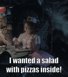 Kitana Turnbull as Carmelita Spats, dressed as a nurse fairy, expresses her desire for a salad with pizzas inside.