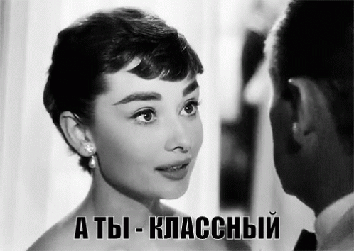 Audrey Hepburn smiling and looking at someone, with the Russian caption 'You are awesome'.