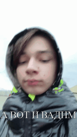 Young man Vadim, wearing a hooded jacket, speaks to the camera with Russian text 'А ВОТ И ВАДИМ'.