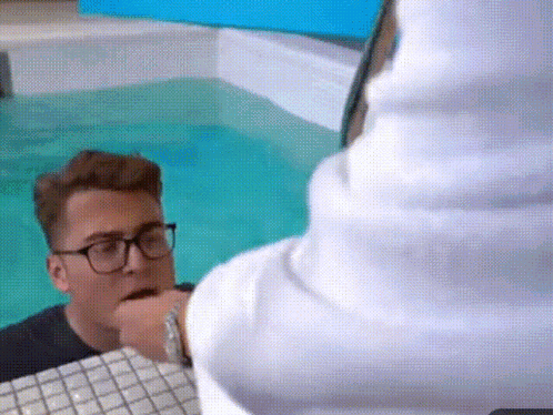 Влад А4 and Кобяков in a pool challenge, with Кобяков putting something in Влад А4's mouth.