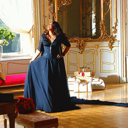 Ahlam Alshamsi elegantly posing in a long black dress within a luxurious, ornate room.