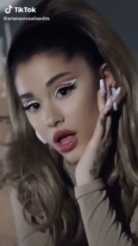 Ariana Grande showcases a stunning makeup look with white eyeliner and long nails in a TikTok video.