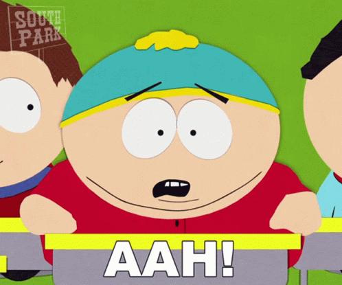 Eric Cartman from South Park reacts with a frightened 'Aah!' expression.