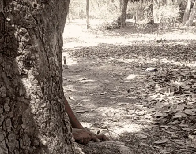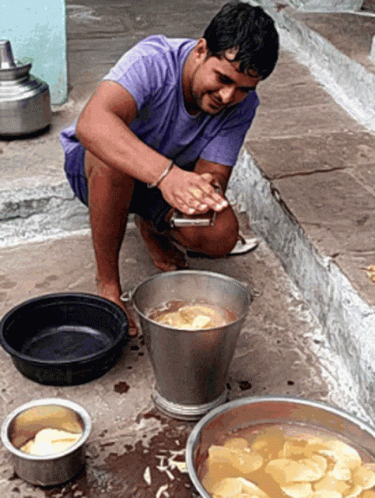 Shivam Kaushik expertly peels potatoes into a bucket, preparing fresh aloo chips outdoors.
