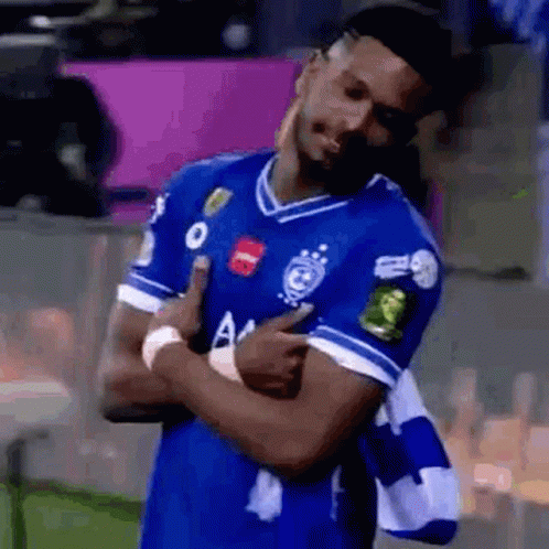 Al-Hilal player Ali Al-Bulaihi smiles and crosses his arms on the soccer field, celebrating a moment.