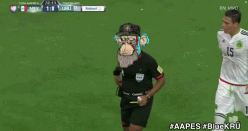 A football referee with a Bored Ape NFT head shows a red card during a Copa America Centenario match.
