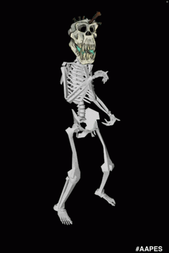 The Aapes Queenape skeleton, featuring an ape-like skull, performs a lively dance on a black background.