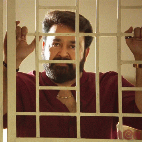 Mohanlal, the Malayalam superstar, looks intensely from behind bars, wearing a maroon shirt.