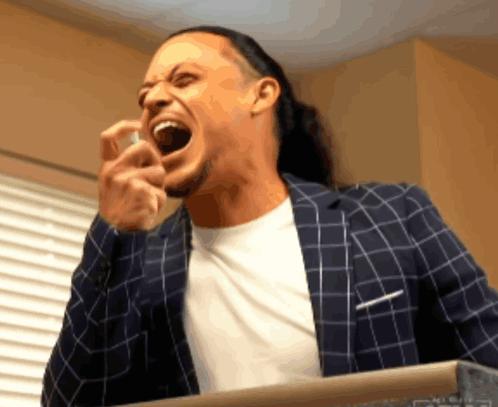 Aaron Solow from AEW is screaming with his mouth wide open, wearing a plaid jacket.
