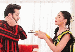 Surbhi Chandna performs a traditional aarti ritual for a man, holding a plate with a diya and sweets.