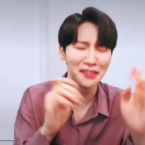 Ab6ix Woong covering his face, appearing sad or crying, wearing a purple shirt.