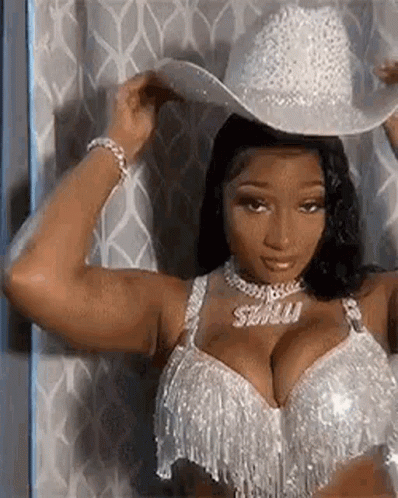 Abbybarb's Megan Thee Stallion poses in a dazzling white cowboy hat and sparkly fringe bra.