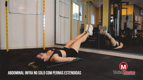 Woman performing extended leg raises (abdominal infra) on the floor in a gym setting.