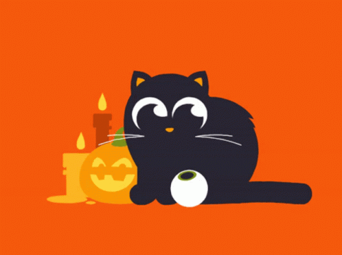 Abell46s' animated black cat playing with an eyeball next to a Halloween pumpkin and candles.