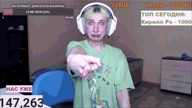 Dasha Koreyka points at the camera with exaggerated, crying then smiling expressions during a livestream.