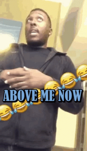 Man in a black jacket gesturing and saying 'Above Me Now' with laughing emojis.