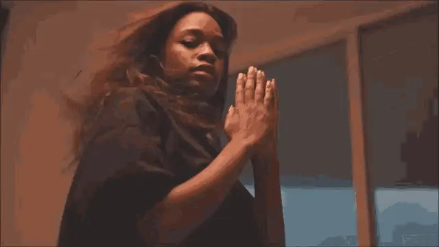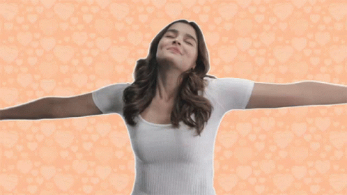 A woman with long hair smiles and hugs herself against a heart-patterned background, embracing self-love.