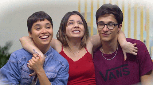 Three friends, two girls and a boy in a Vans t-shirt, share a joyful hug and laugh together.