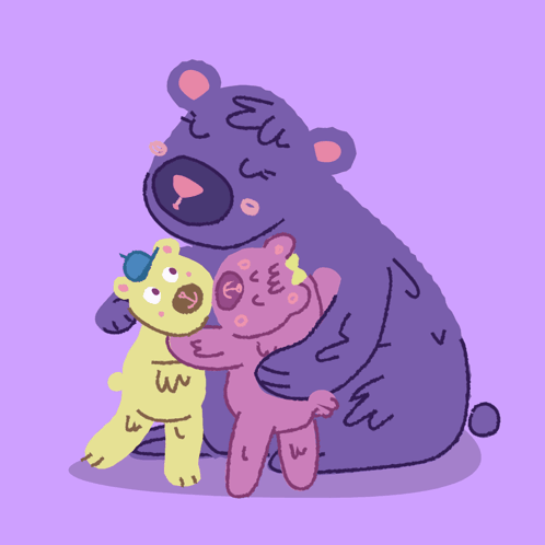 Purple mama bear hugs her two cubs, a yellow and a pink bear, surrounded by loving hearts. Happy Mother's Day!