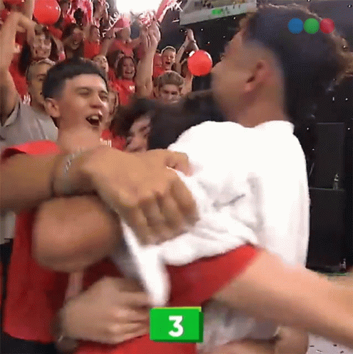 Agustín is embraced by friends in an emotional moment, with a '3' visible on screen during a celebration.