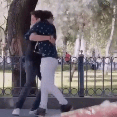 Aristoteles Corcega and Temo Lopez share a warm hug on a sidewalk.