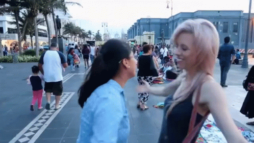 Superholly shares warm embraces with friends in a lively public square, capturing a moment of connection.
