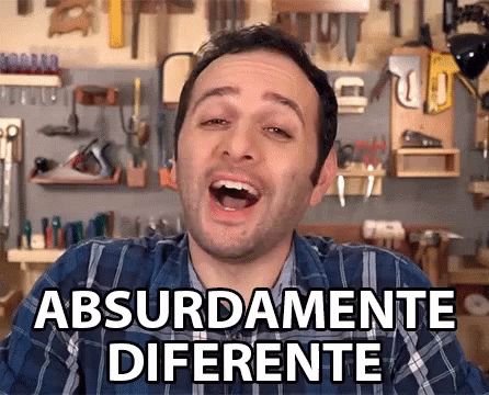A man in a plaid shirt emphatically says 'Absurdamente Diferente' in front of a workshop wall.