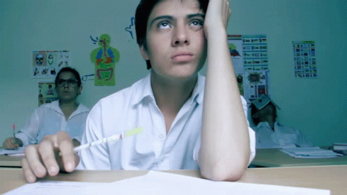 A student in a classroom looks bored and thoughtful, resting his head on his hand while holding a pen.