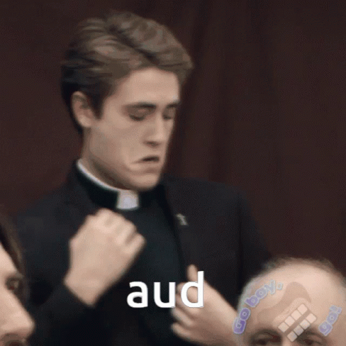 A man in a clergy collar holds his hands to his chest, looking at the camera, with the word "aud" overlaid.