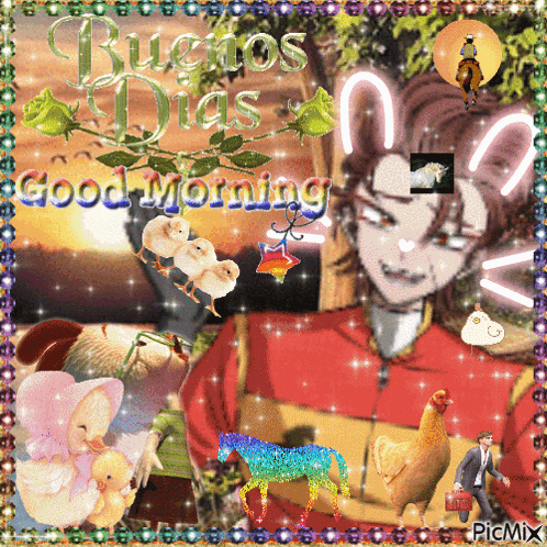 Ace Markey from Danganronpa Despair Time in a vibrant "Good Morning" collage with chicks, a duck, and a horse.
