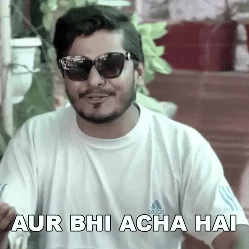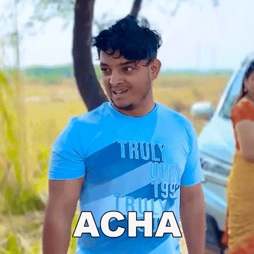 Prince Pathania, wearing a blue shirt, smiles and says 'Acha' in a rural setting.