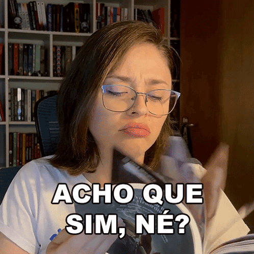 Joice Cardoso reading a book and saying 'Acho Que Sim, Né?' with a thoughtful expression.
