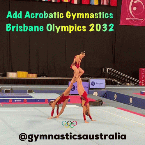 Three acrobatic gymnasts perform a human pyramid, advocating for Acrobatic Gymnastics in the Brisbane Olympics 2032.