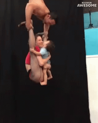 A family performs an incredible acrobatic feat, with a man holding a woman by her legs while she cradles a child.