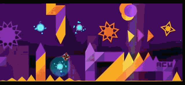 Fast-paced gameplay of the Acu level in Geometry Dash, featuring vibrant colors and complex obstacles.