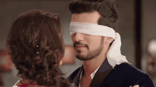 Adaa Khan in a red saree, intimately interacting with a blindfolded man, who touches her face and waist.