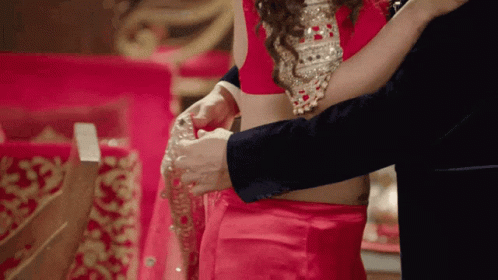 Adaa Khan in a red saree shares an intimate moment with a blindfolded man in a dramatic scene.