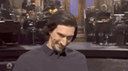 Adam Driver's creepy smile on SNL while standing on stage in a black shirt.
